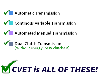 The CVET transmission is a radically unique technology. It transforms rotary power from gas engines and electric motors at output speeds and torques as needed to drive a vehicle. CVET technology makes it possible to attain the highest efficiency of energy usage under all city and highway driving conditions. CVET technology produces lower gas consumption during both start/stop city driving and highway driving. CVET technology extends the driving distance between battery charging for Electric Vehicles. CVET technology offers a smooth transition from gas and diesel vehicles to Electric Vehicles. CVET technology accomplishes the lowest possible energy usage under all driving conditions.